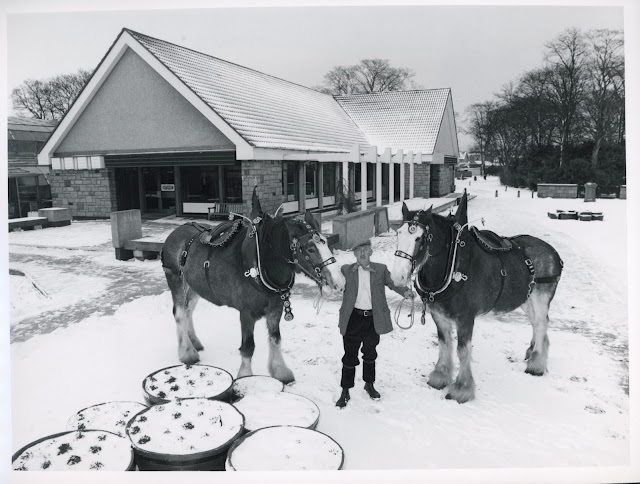 The bulk of the photographs in this post are from the album “Clydesdale Horses” and were taken between 1980 and 1983. These images show the beautiful horses usually found in Duthie Park during this period. These first images of the horses show them amongst the snow during the Winter.